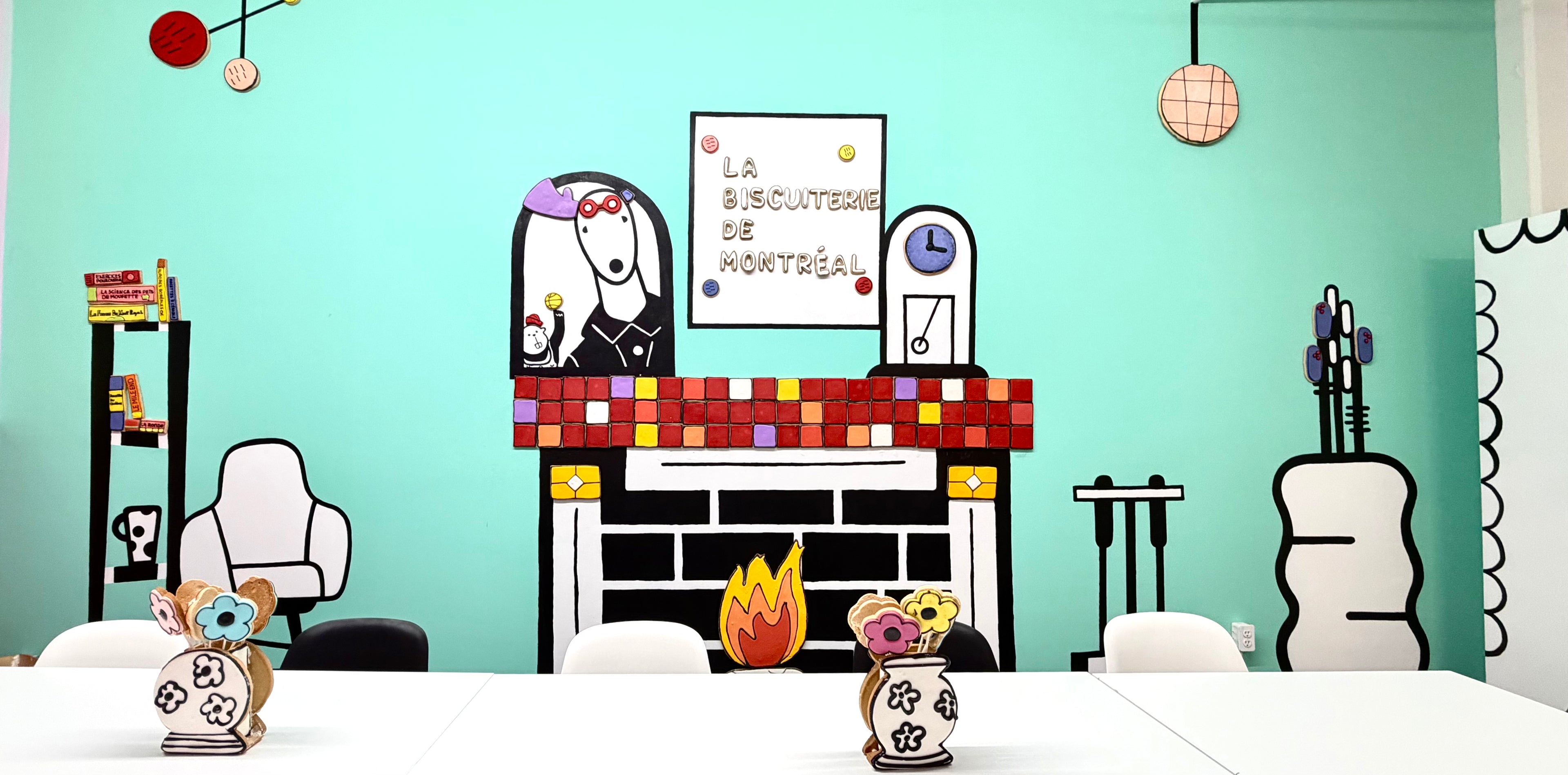 Située dans le Mile End, La Biscuiterie de Montréal est un espace magique décoré avec des biscuits géants et nos illustrations iconiques.