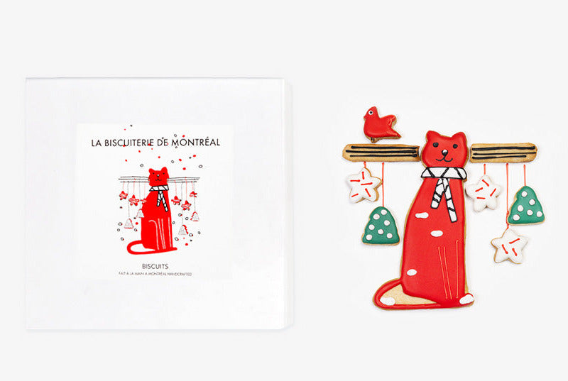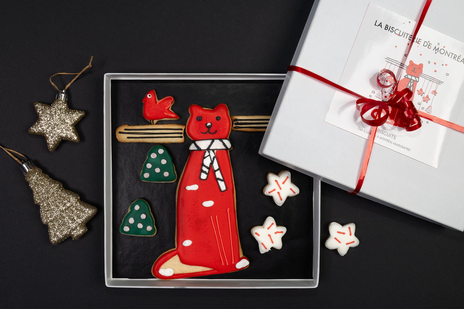 Magnifique boîte de luxe en carton rigide avec auto-collant agencé aux biscuits. L’auto-collant est illustrée par l'équipe de La Biscuiterie et imprimé à Montréal.