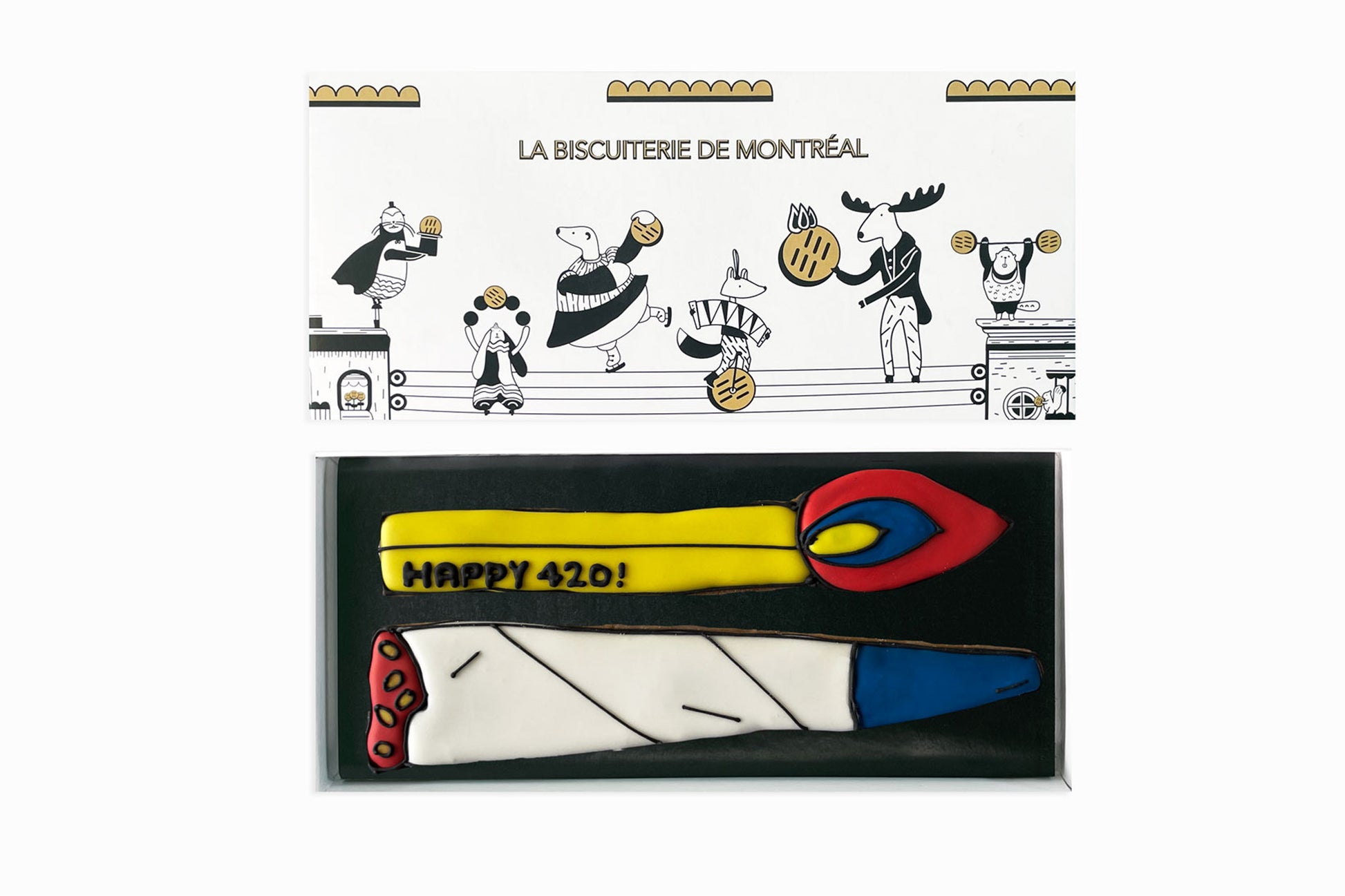 Superbe boîte en carton rigide illustrée par l'équipe de La Biscuiterie et imprimée à Montréal. On y voit les animaux de la forêt boréale en saltimbanques dans un décor inspiré des ruelles typiques de Montréal.