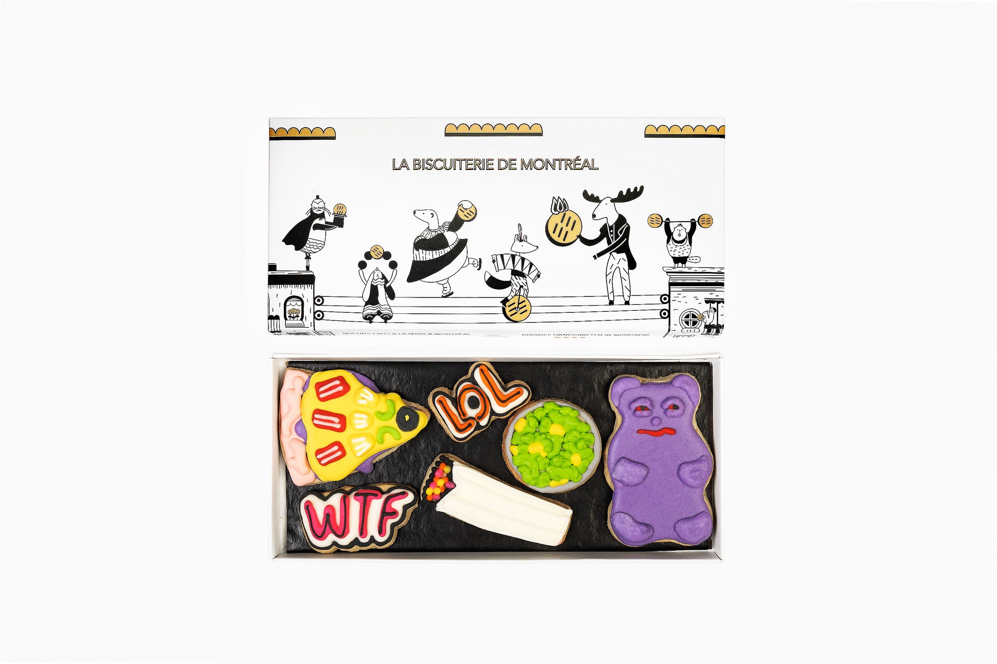 Superbe boîte en carton rigide illustrée par l'équipe de La Biscuiterie et imprimée à Montréal. On y voit les animaux de la forêt boréale en saltimbanques dans un décor inspiré des ruelles typiques de Montréal.