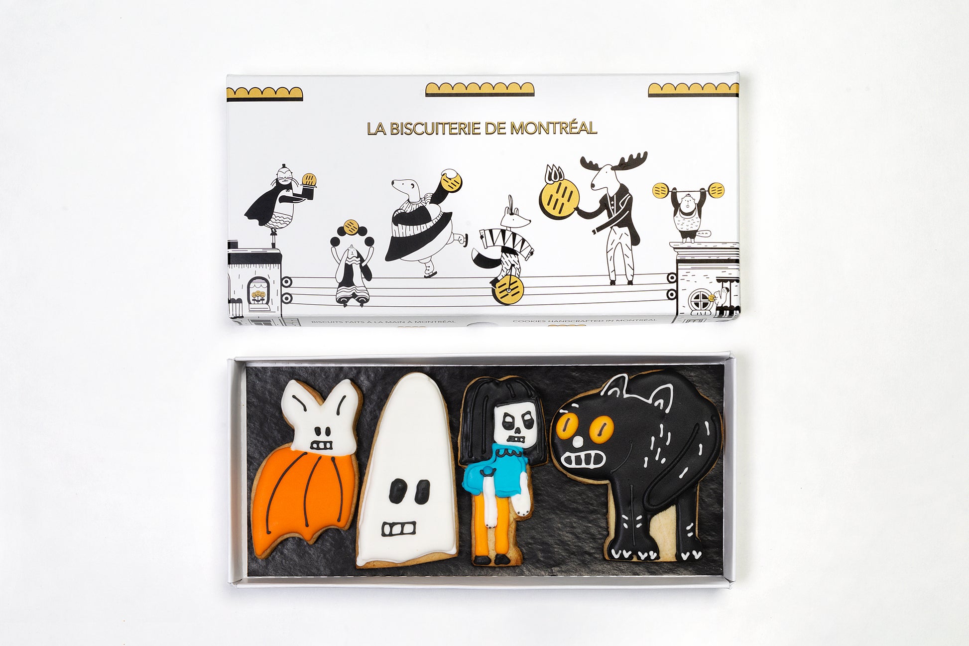 Superbe boîte en carton rigide illustrée par l'équipe de La Biscuiterie et imprimée à Montréal. On y voit les animaux de la forêt boréale en saltimbanques dans un décor inspiré des ruelles typiques de Montréal.