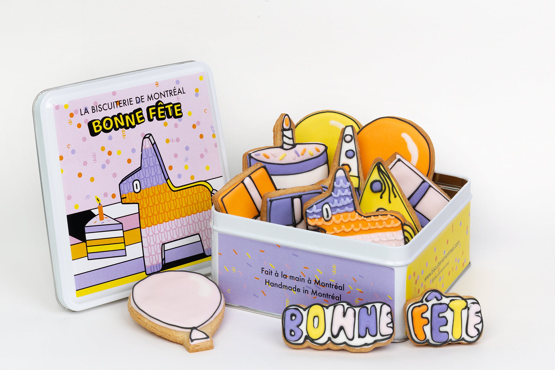 Belle boite en aluminium illustrée sur 5 côtés par l’équipe de La Biscuiterie. Nos magnifiques illustrations sont agencées aux biscuits. Les chanceux qui recevront cette boite la garderons sans doute. = 5