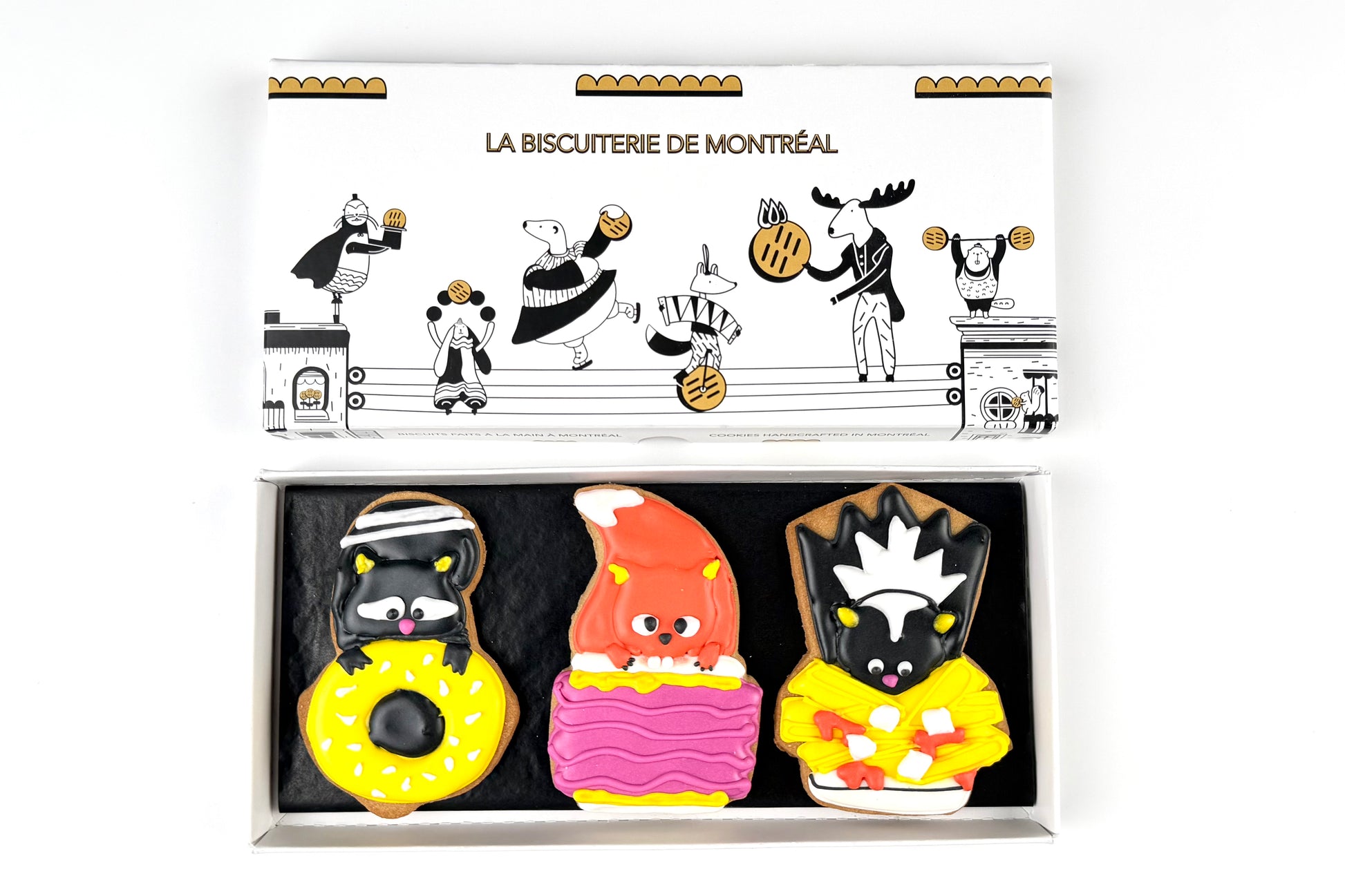 Superbe boîte en carton rigide illustrée par l'équipe de La Biscuiterie et imprimée à Montréal. On y voit les animaux de la forêt boréale en saltimbanques dans un décor inspiré des ruelles typiques de Montréal.