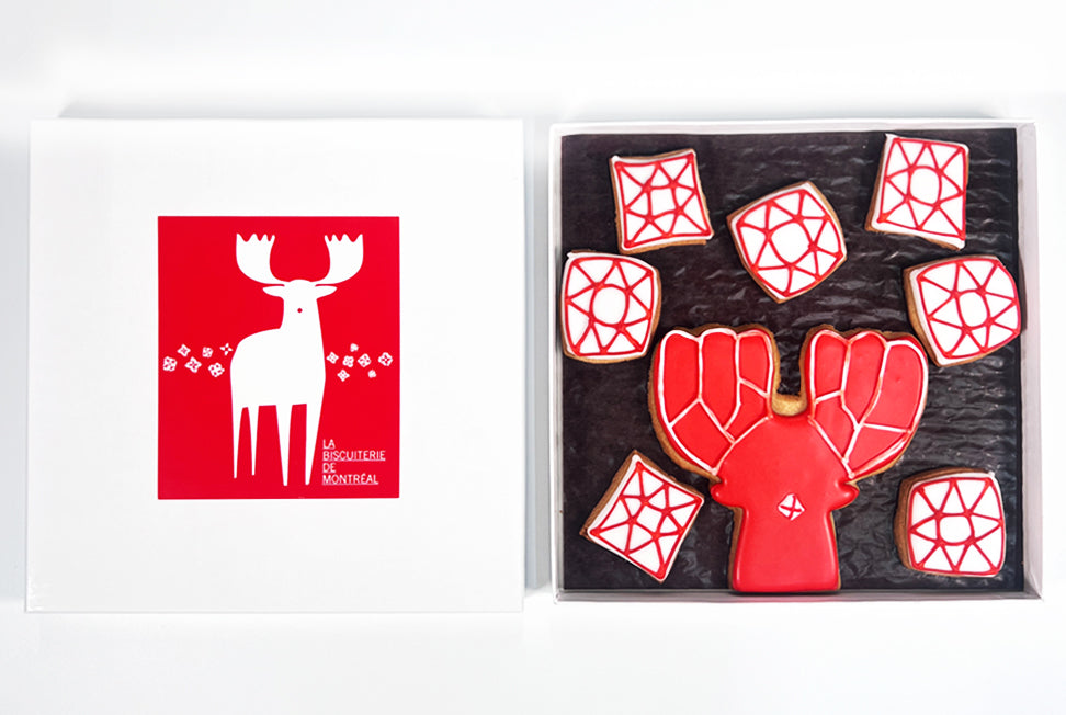 Magnifique boîte de luxe en carton rigide avec auto-collant agencé aux biscuits. L’auto-collant est illustrée par l'équipe de La Biscuiterie et imprimé à Montréal.