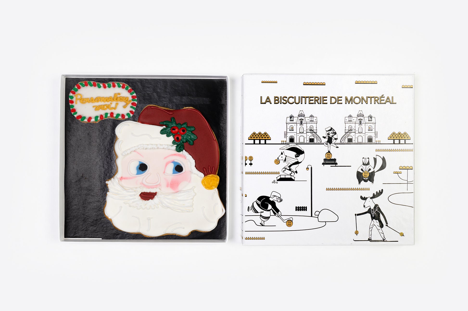 Magnifique boîte de luxe en carton rigide illustrée par l'équipe de La Biscuiterie et imprimée à Montréal. On y voit des animaux de la forêt boréale s’amusant avec des biscuits dans une scène hivernale typiquement montréalaise.