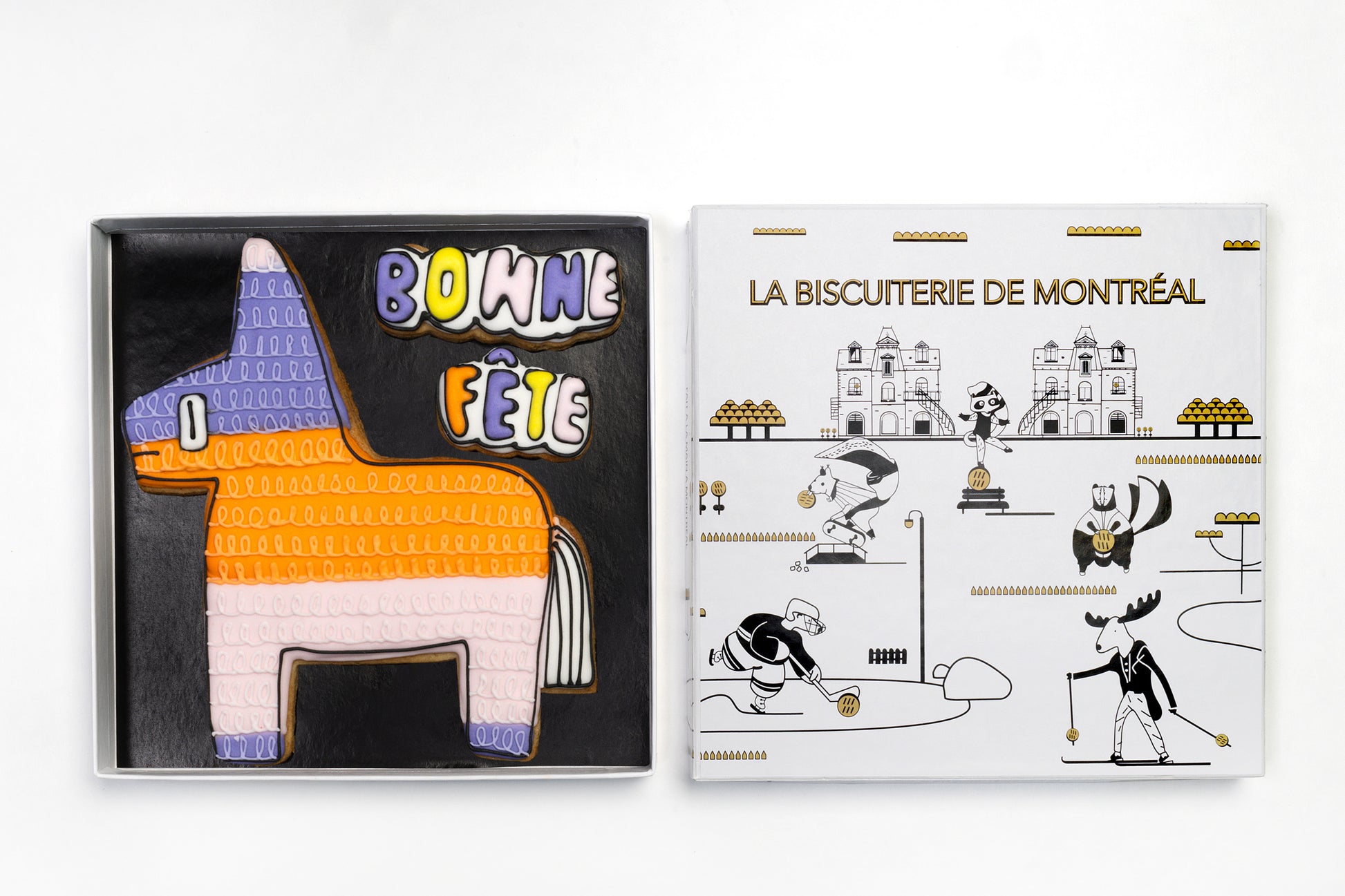 Magnifique boîte de luxe en carton rigide illustrée par l'équipe de La Biscuiterie et imprimée à Montréal. On y voit des animaux de la forêt boréale s’amusant avec des biscuits dans une scène hivernale typiquement montréalaise.