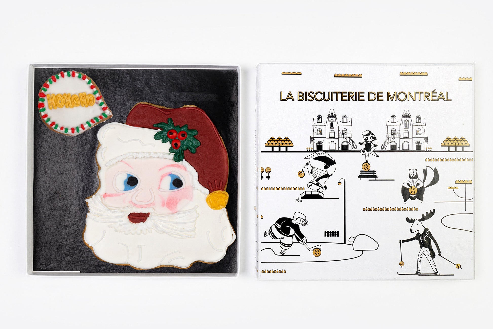 Magnifique boîte de luxe en carton rigide illustrée par l'équipe de La Biscuiterie et imprimée à Montréal. On y voit des animaux de la forêt boréale s’amusant avec des biscuits dans une scène hivernale typiquement montréalaise.